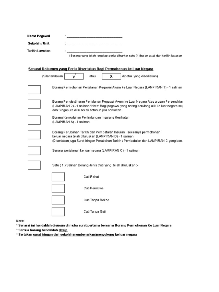 Lampiran amenghadiri persidangan seminar, lawatandan lawatan persendirian ke luarnegeri ( borang mengikut keperluan suratpekeliling am bil. Sebarang masalah/pertanyaan berhubung prosedur atau tatacara permohonan keluar negara boleh menghubungi pihak urusetia permohonan keluar negara atas urusan persendirian di. Slip pengesahan penerimaan borang permohonan. Garis panduan permohonan perjalanan pegawai awam ke luar negara urusan persendirian 2019 ii. Borang permohonan ke luar neg.