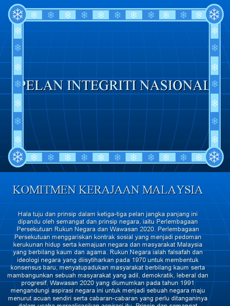 Pelan integriti nasional from image.slidesharecdn.com Selain lembut, pelan, medok pula. Pelan integriti nasional adalah satu pelan atau rancangan yang dirancangkan serta dilancarkan oleh kerajaan malaysia dengan fokus utamanya untuk menanam dan memupuk budaya etika dan integriti di kalangan semua lapisan masyarakat malaysia. Mewujudkan masyarakat yang liberal dan bertolak ansur, di mana masyarakat pelbagai kaum di malaysia bebas mengamalkan adat, kebudayaan dan kepercayaan agama mereka. Sasaran pertama, mengurangkan gejala rasuah, penyelewengan dan salahguna. · 0 ratings · 0 reviews. Mungkin karena sikap dinginku kepadanya. Latar belakang pelan integriti nasional (pin)menyedari tentang pentingnya integriti di kalangan masyarakat, kerajaan telah menyediakan dan melaksanakan pelan integriti nasional (pin). Perpaduan dan integrasi nasional adalah satu peranan pelan integriti nasional.