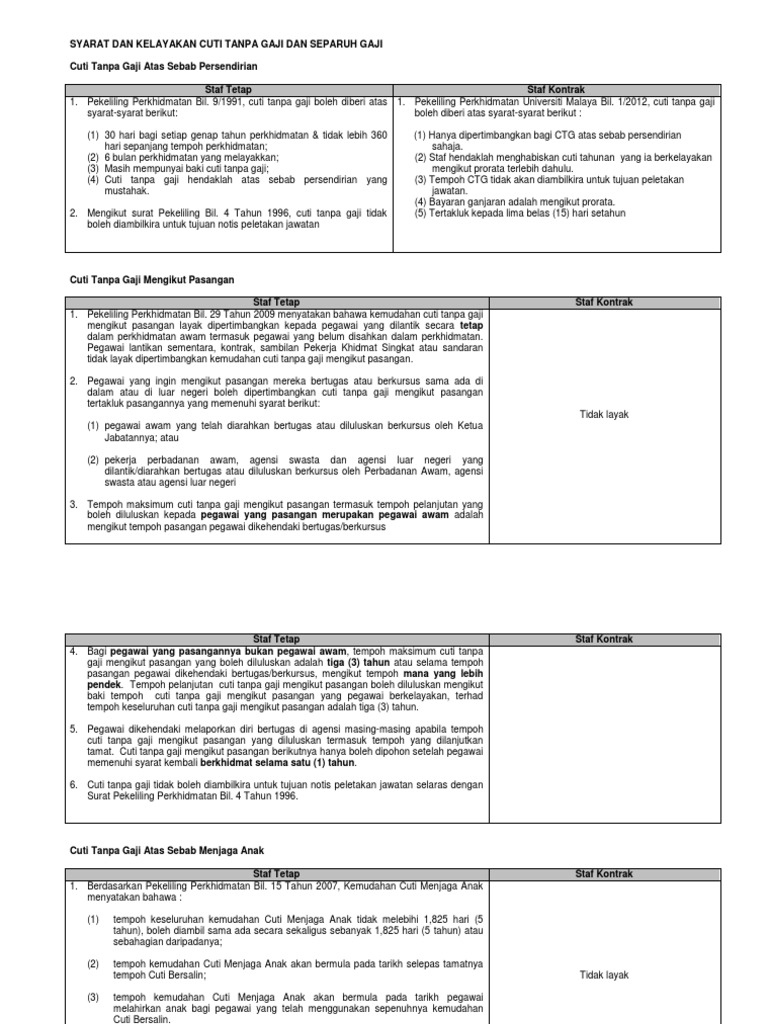 Syarat Cuti Tanpa Gaji - Contoh surat cuti kerja untuk berbagai alasan.. Saya, ketua jabatan dengan ini memberikan cuti tanpa gaji tidak kerja (awol) kepada kakitangan berikut atas sebab beliau tidak hadir bekerja tanpa sebab yang boleh. Cuti tanpa gaji bertujuan bagi urusan persendirian yang mustahak yang tidak menyalahi peraturan dan f) pegawai yang telah menghabiskan kelayakan maksimum 360 hari cuti tanpa gaji, boleh 9 tahun 1991 (1 januari 1992) c) surat pekeliling bil.4 tahun 2009. (b) telah menunjukkan prestasi kerja yang baik; Hal ini akan membuat mereka membutuhkan waktu untuk berhenti bekerja atau cuti sementara. Namun, jika izin cuti lebih dari 4 bulan, maka gaji karyawan biasanya hanya dibayar sebesar 75%.